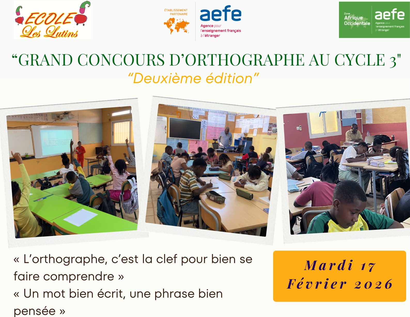 Dans le cadre de la promotion de l’excellence scolaire et de la maîtrise de la langue française, notre établissement a organisé la 2ᵉ édition du Grand Concours d’Orthographe du Cycle 3, réunissant les élèves de CM1 et de CM2.